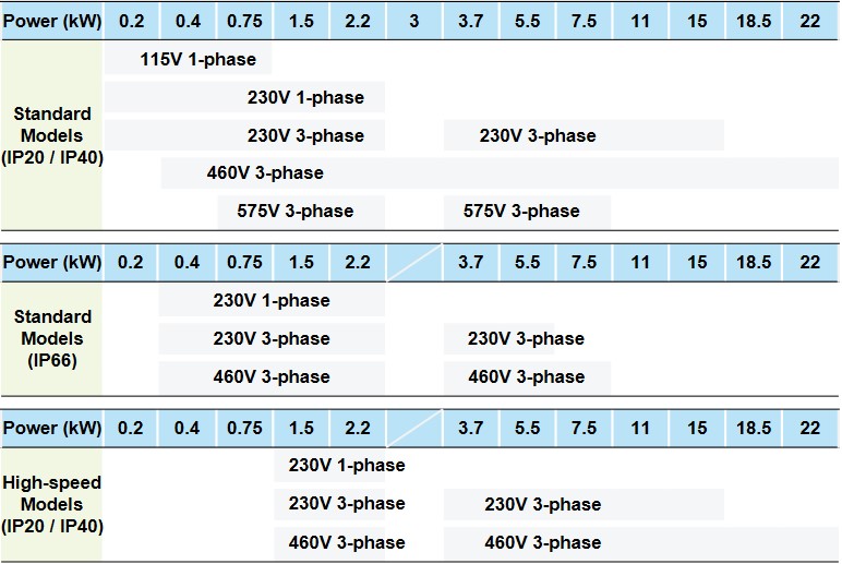 - High speed models: 0 to 1,500 Hz (V/f control for IM motor only)