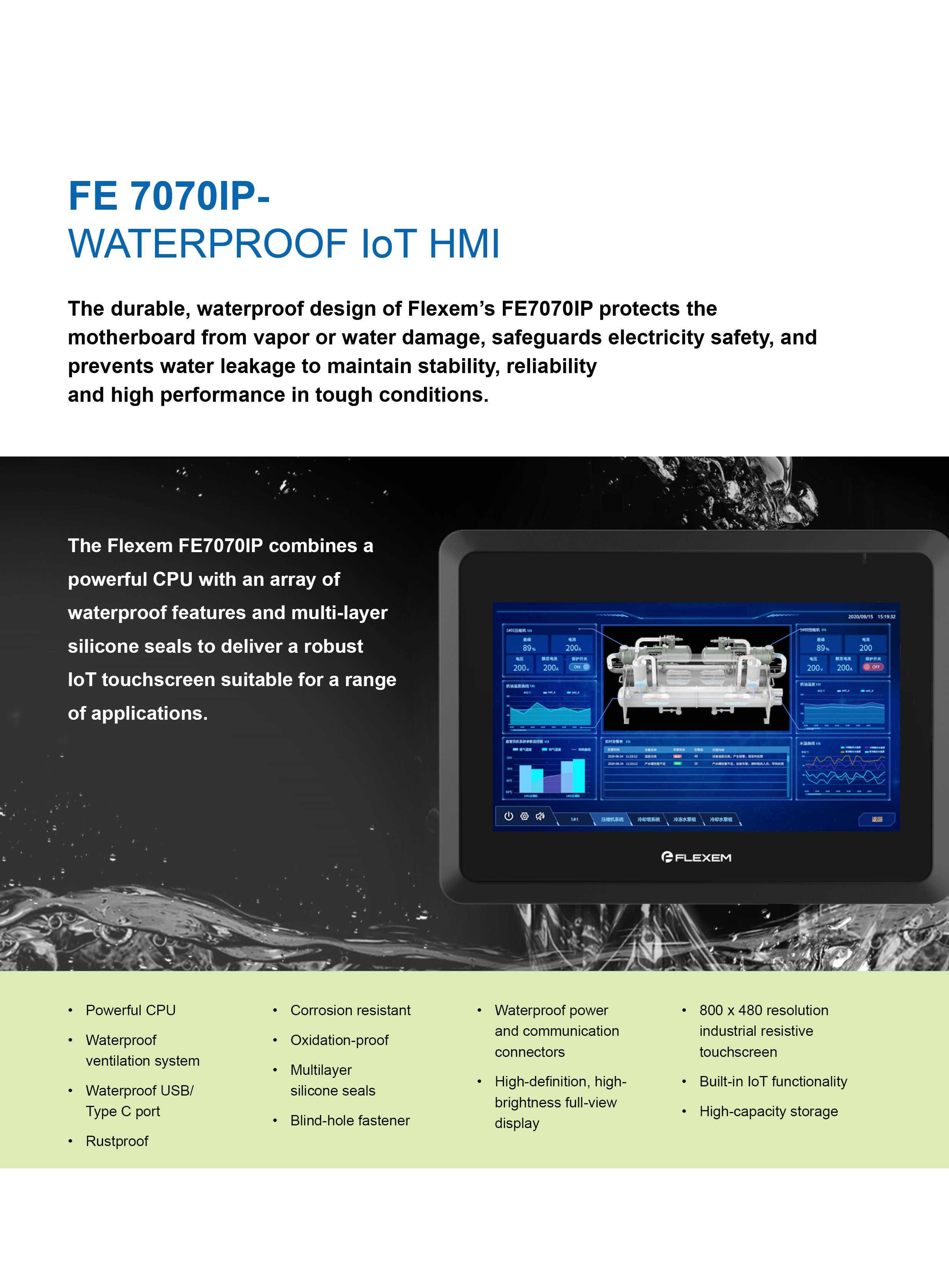 The Flexem FE7070IP combines a powerful CPU with an array of waterproof features and multi-layer silicone seals to deliver a robust IoT touchscreen suitable for a range of applications.