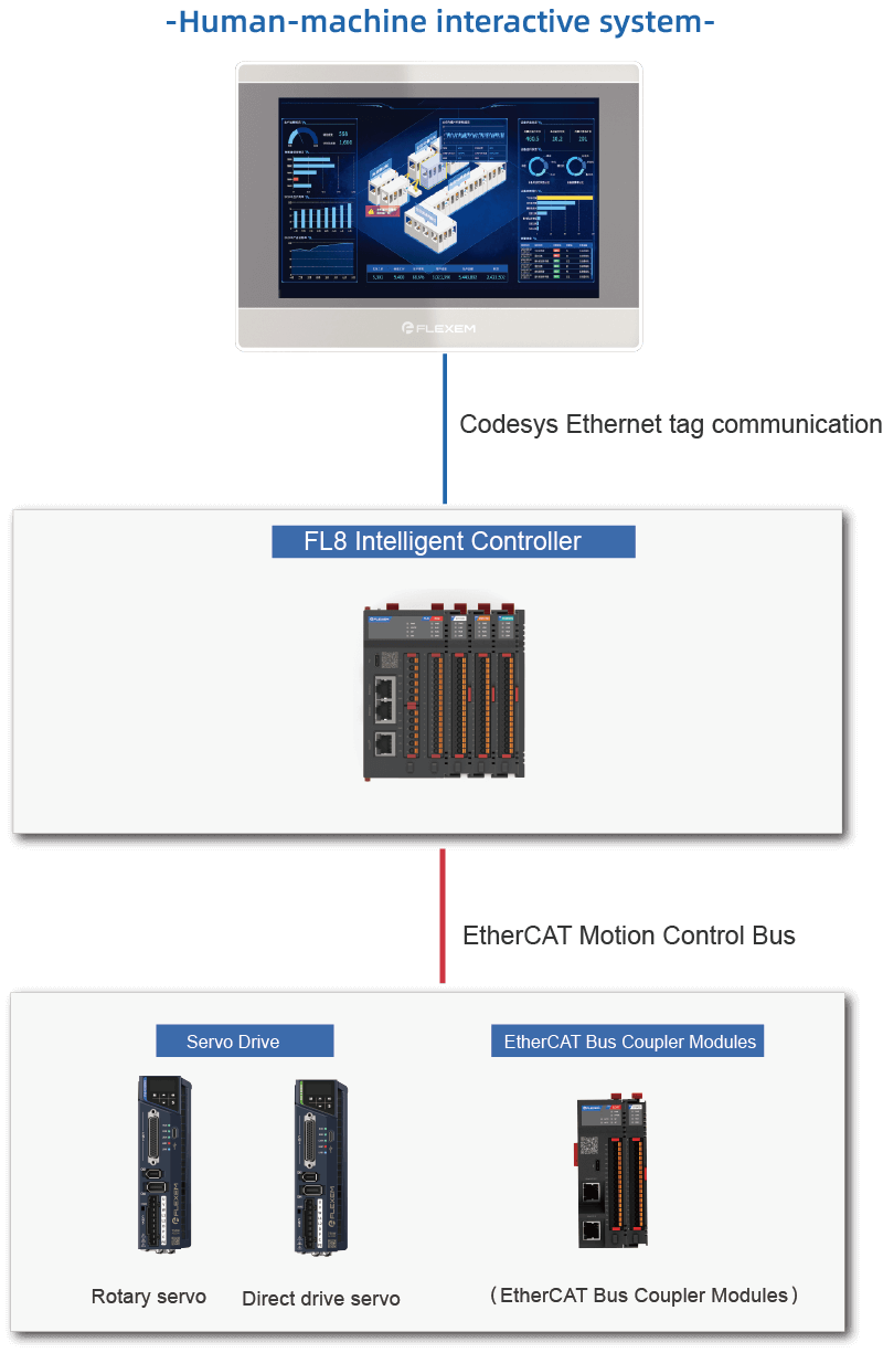 FL8 intelligent controller is a medium-sized PLC developed based on the Codesys platform, with IEC61131-3 architecture, built-in high-speed EtherCAT motion control bus, built-in Ethernet and serial port, support for OPC UA and Modbus protocols, seamless connection to the upper control system, and optimization of the overall system.